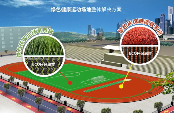 绿色健康运动场地整体解决方案不仅指环保人造草,而是整个运动地面材料系统均采用环保材料:跑道系统、人造草系统中所包含的背胶、填充颗粒、胶水、缓冲垫层等所有原材料及辅料。