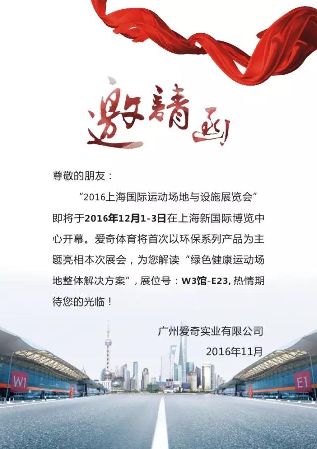 “2016上海运动场地与设施展览会”即将于2016年12月1-3日在上海新博览中心开幕。爱奇体育将以环保系列产品为主题亮相本次展会,为您解读“绿色健康运动场地整体解决方案”, 展位号:W3馆-E23, 热情期待您的光临!