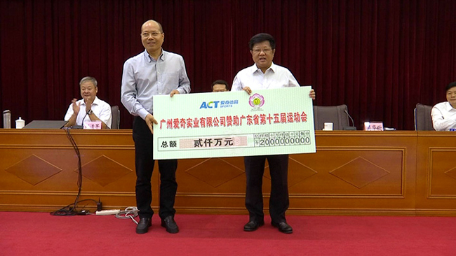 肇庆市委副书记、政法委书记吴华钦(右)代表市筹委会,接受爱奇体育董事长雷爱新先生(左)的赞助支票。