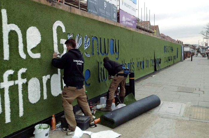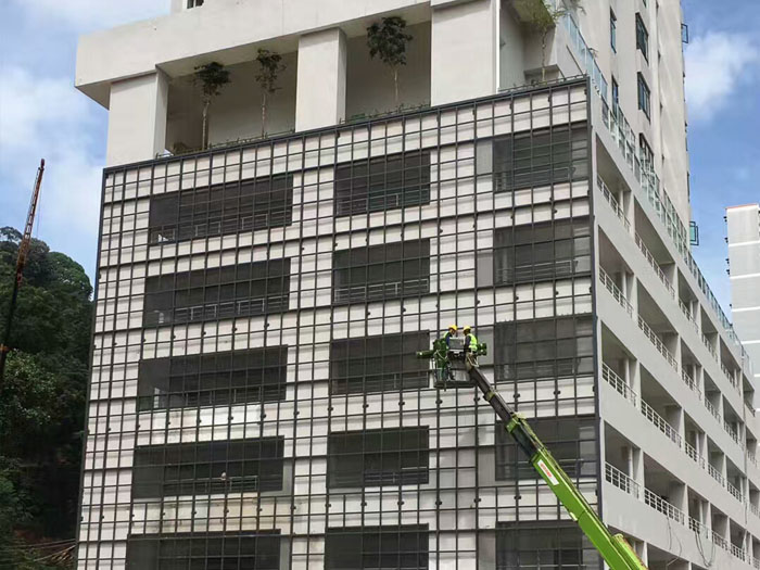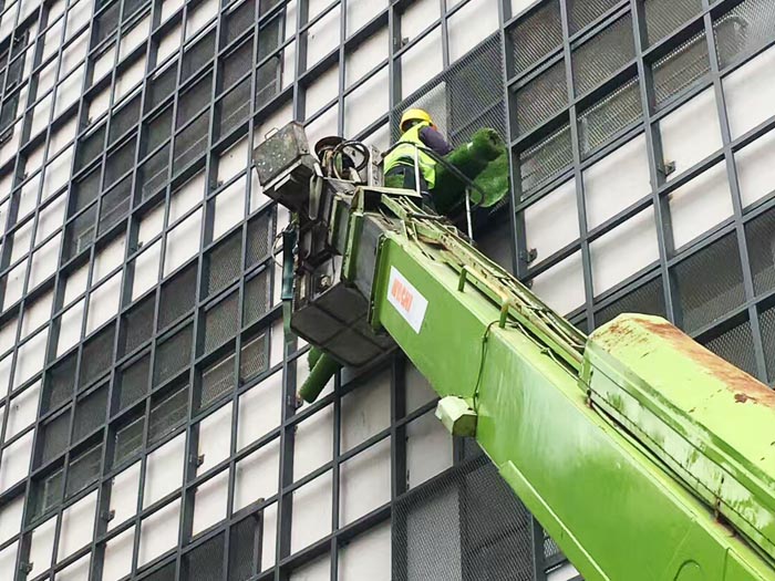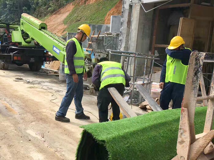 3. 使用升降机将拼接好的草皮安装上楼面的围栏架,确保稳固结实;