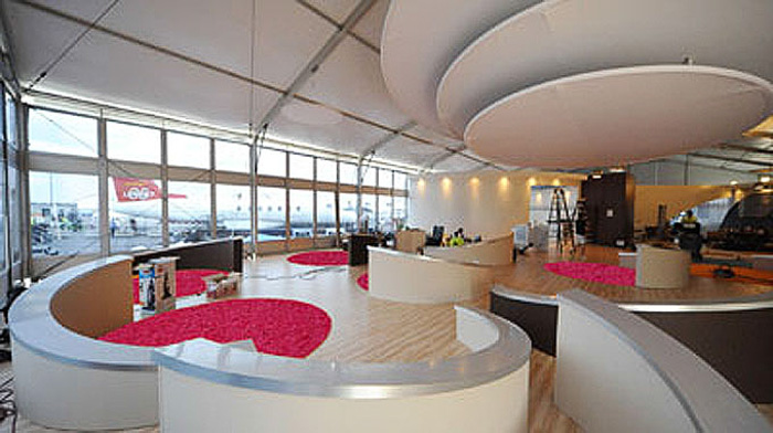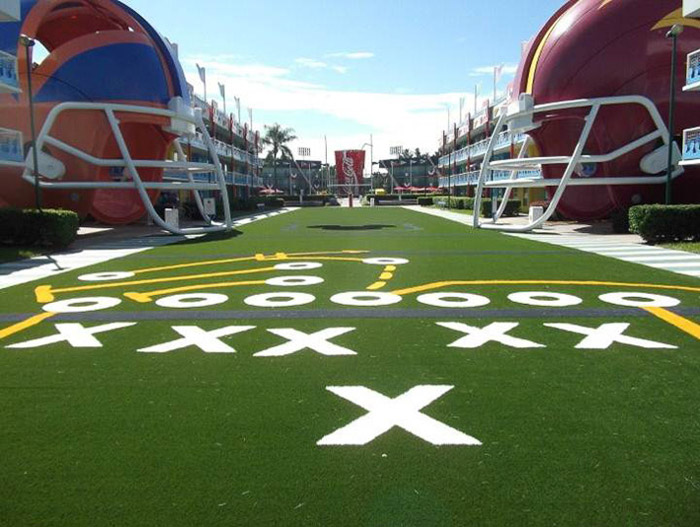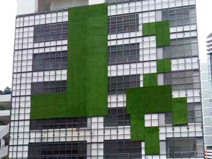 拼接成格子形状,再用LED灯做成大楼标志,装点于人造草上。