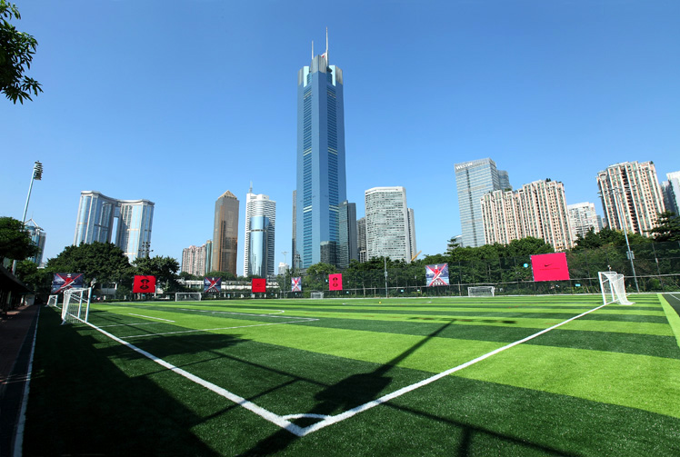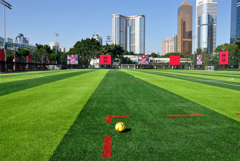 人造草坪的选择:为顺应国家倡导的环保、绿色及健康要求,人造草坪选择使用了高规格爱奇可回收环保人造草产品,底部为无色无味的高性能环保透明背胶,100%可回收。高磅重创新结构的草丝挺度更佳,均一的球与草坪的相互作用表现,为球员提供更好的控球感,更合理的草丝分布方式可以减轻场地使用寿命内填充物板结的现象。