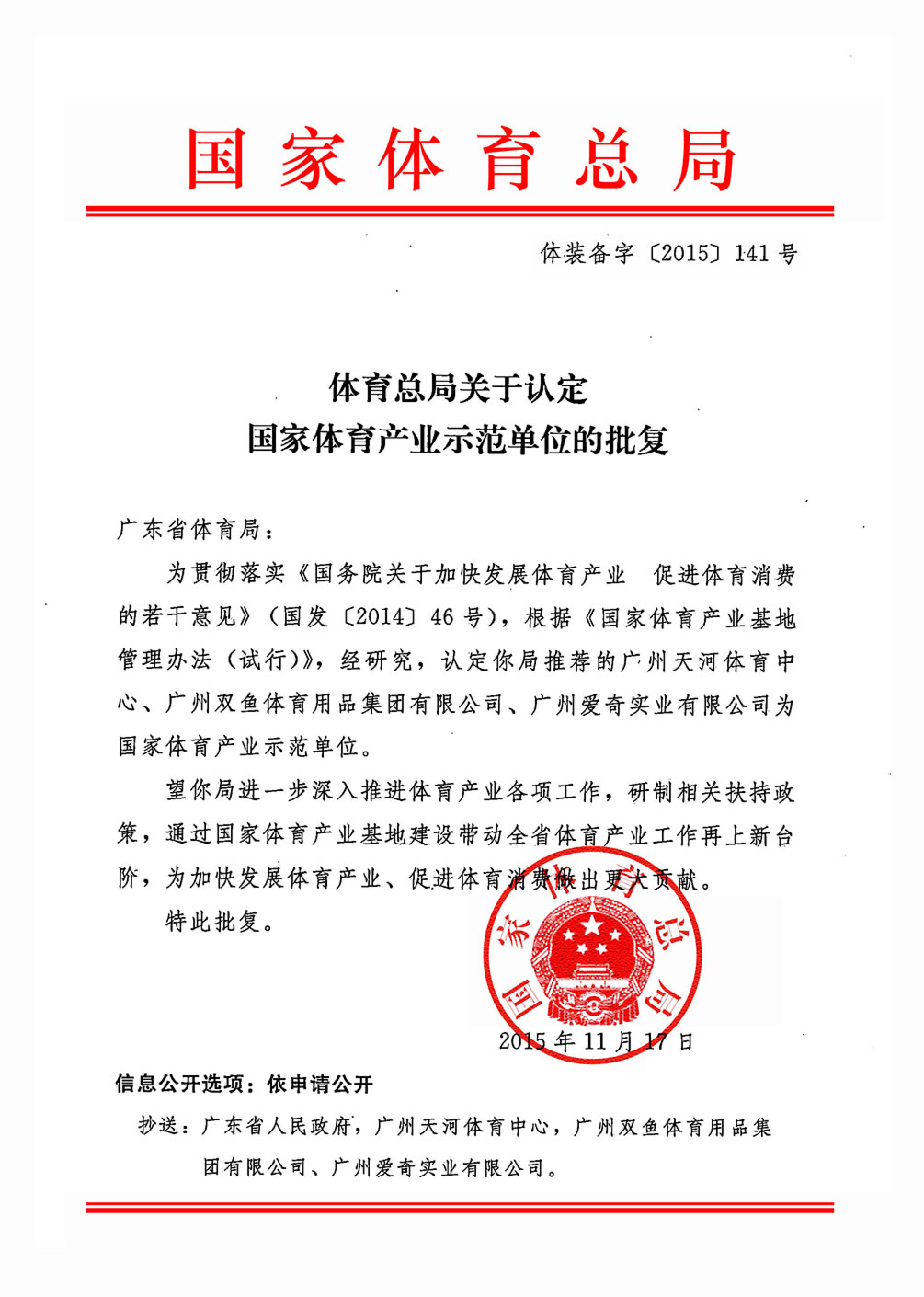 近日,体育总局正式批复:爱奇实业有限公司为体育产业示范单位。这是广东省获此殊荣的民营企业。截至目前,全国体育产业示范单位只有18个。这也是自《46号文》颁布之后,体育产业企业基于体育总局层面的全国评选。