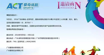 9月9日, 2016广东体博会,足球专区,爱奇体育将点燃2016青少年足球三人对抗赛,恒大、富力、足球名宿前来助阵!你,来不来?! 同期,爱奇体育PPP项目模式,及爱奇全系列绿色环...