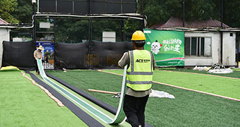 体育东路足球场位于广州天河体育中心,目前场地正在翻新改造,项目采用爱奇人造草,并由爱奇实业负责专业施工。即使在高温湿热环境下,工人们依旧专注铺设人造草皮。